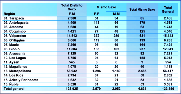 A nivel nacional donde se han celebrado más matrimonios con parejas del mismo sexo es la Metropolitana (2.485), le siguen: Valparaíso (631), O’Higgins (118) y Biobío (237).